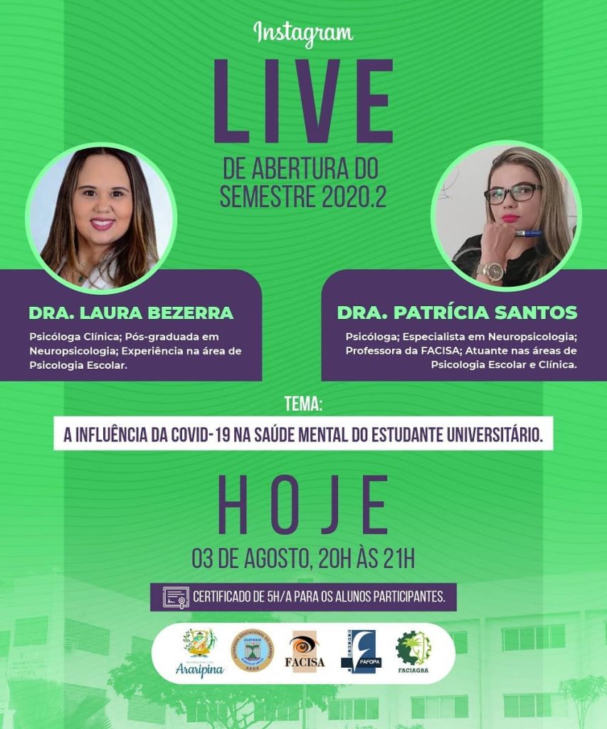 A Autarquia Educacional do Araripe (AEDA), como forma de iniciar o semestre 2020.2 e receber os alunos novatos e veteranos, estará promovendo na noite de hoje, 3, uma live no seu perfil oficial no instagram (@aeda.araripe), com a temática: “A influência da COVID-19 na saúde mental do estudante universitário”.