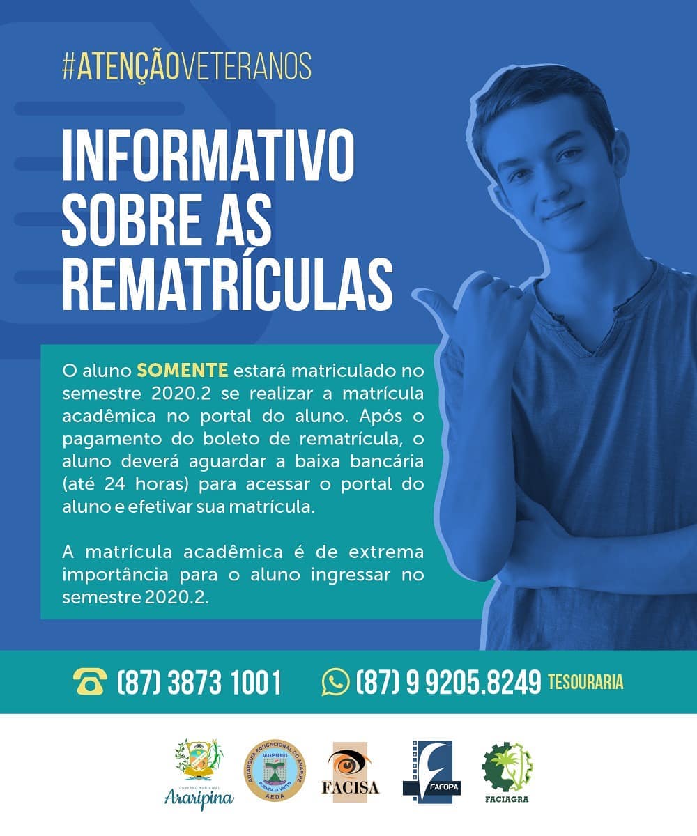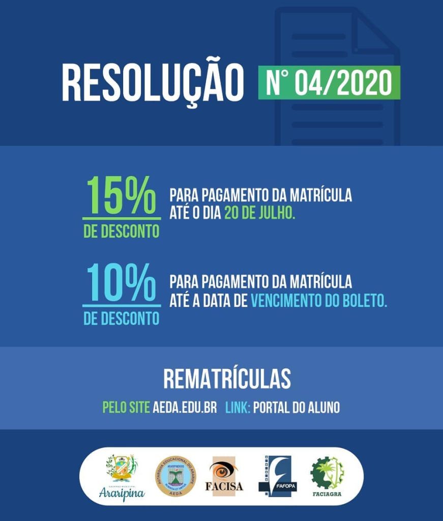 Foi publicada na manhã desta segunda-feira (29) a Resolução N°04/2020, que trata sobre a rematrícula dos alunos veteranos para o semestre letivo 2020.2. Será concedido 15% desconto para os alunos que efetuarem o pagamento da matrícula até o dia 20 de julho de 2020, e 10% de desconto para os alunos que efetuarem o pagamento da matrícula até a data de vencimento do boleto.