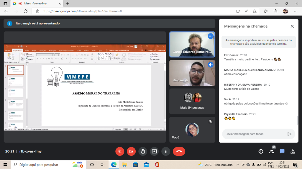 Dez estudantes do curso de Direito da Faculdade de Ciências Humanas e Sociais de Araripina (Facisa) apresentaram trabalhos científicos, no modelo de resumo, na VI Mostra de Ensino, Pesquisa e Extensão do Vale do São Francisco. O evento foi promovido pela Faculdade de Ciências Aplicadas e Sociais de Petrolina (FACAPE) nos dias 18 a 20 de maio de forma online.