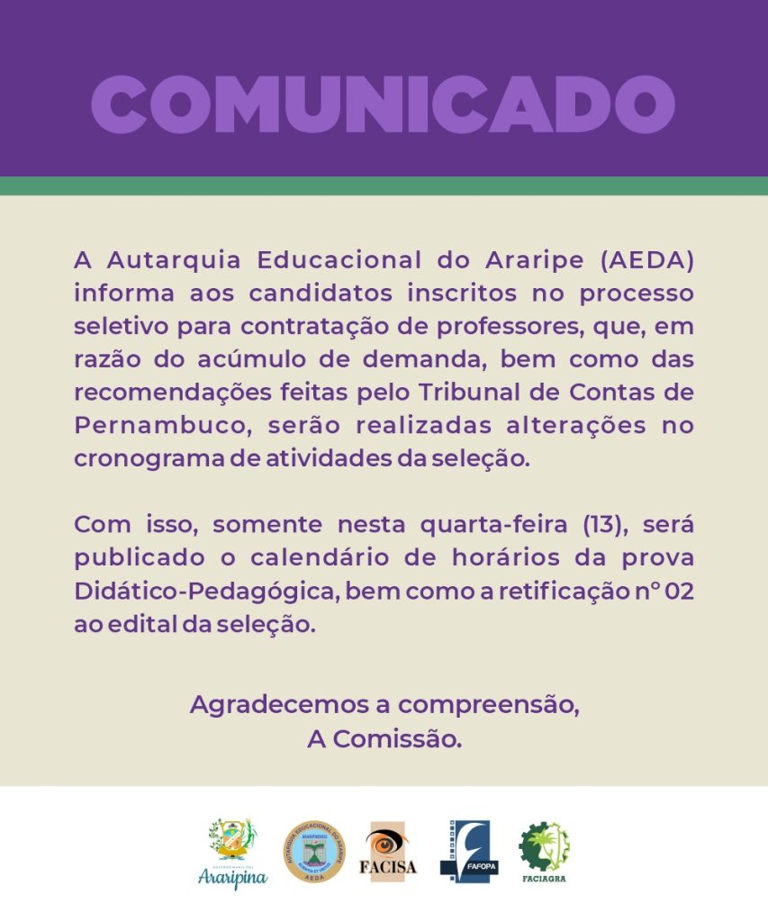 A Autarquia Educacional do Araripe (AEDA) informa aos candidatos inscritos no processo seletivo para contratação de professores, que, em razão do acúmulo de demanda, bem como das recomendações feitas pelo Tribunal de Contas de Pernambuco, serão realizadas alterações no cronograma de atividades da seleção.
