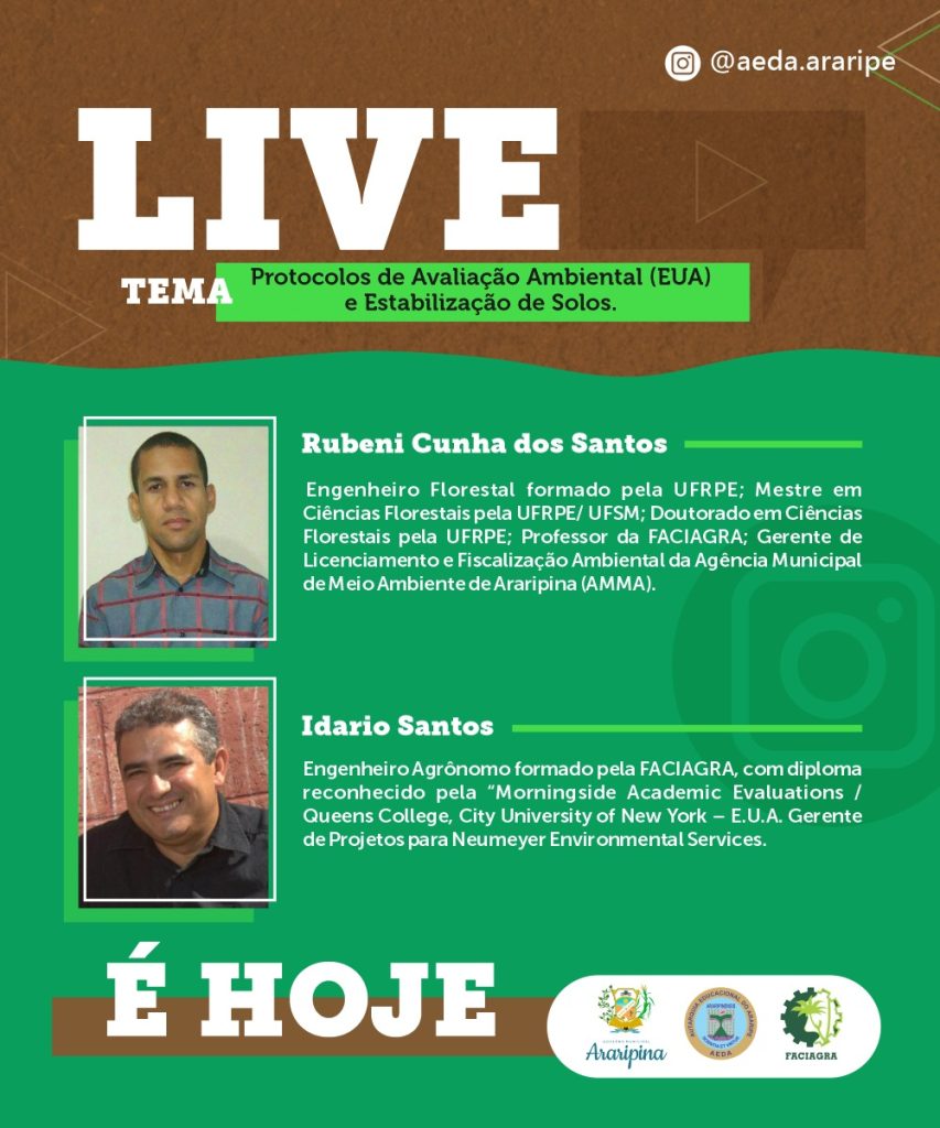 20h às 21h: “Protocolos de Avaliação Ambiental (EUA) e Estabilização de Solos”, com Idario Santos e o professor Rubeni Cunha.