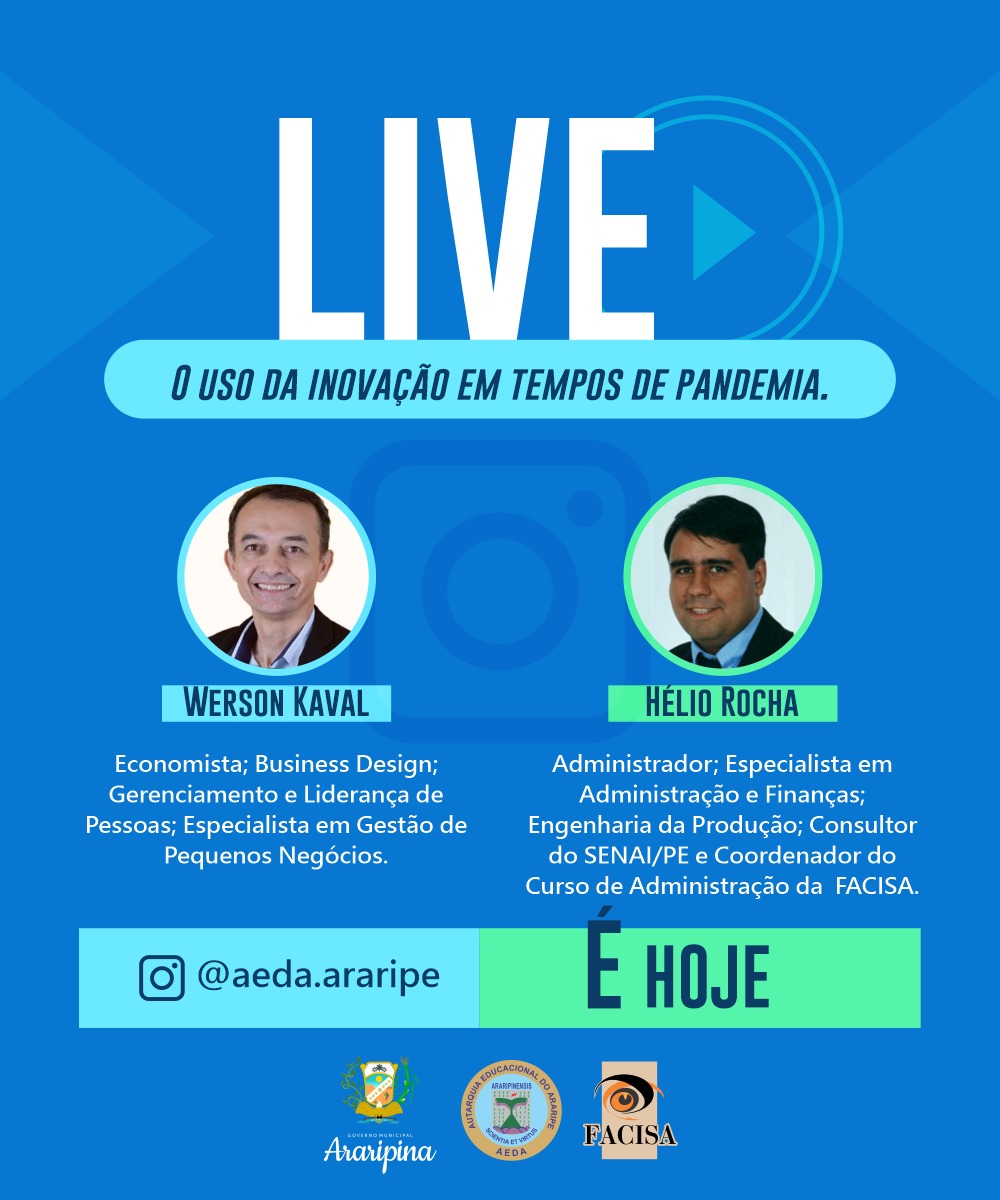 19h às 20h: “O uso da inovação em tempos de Pandemia”, com o Economista Werson Kaval e o professor Hélio Rocha.