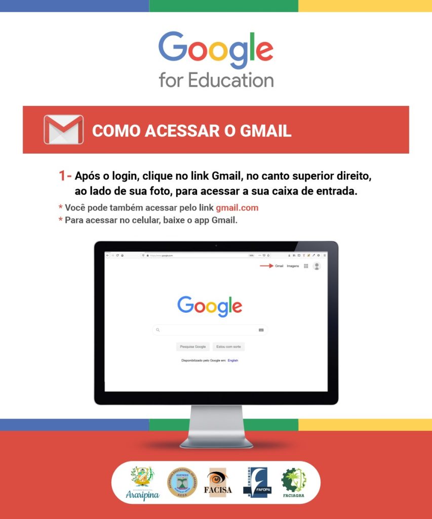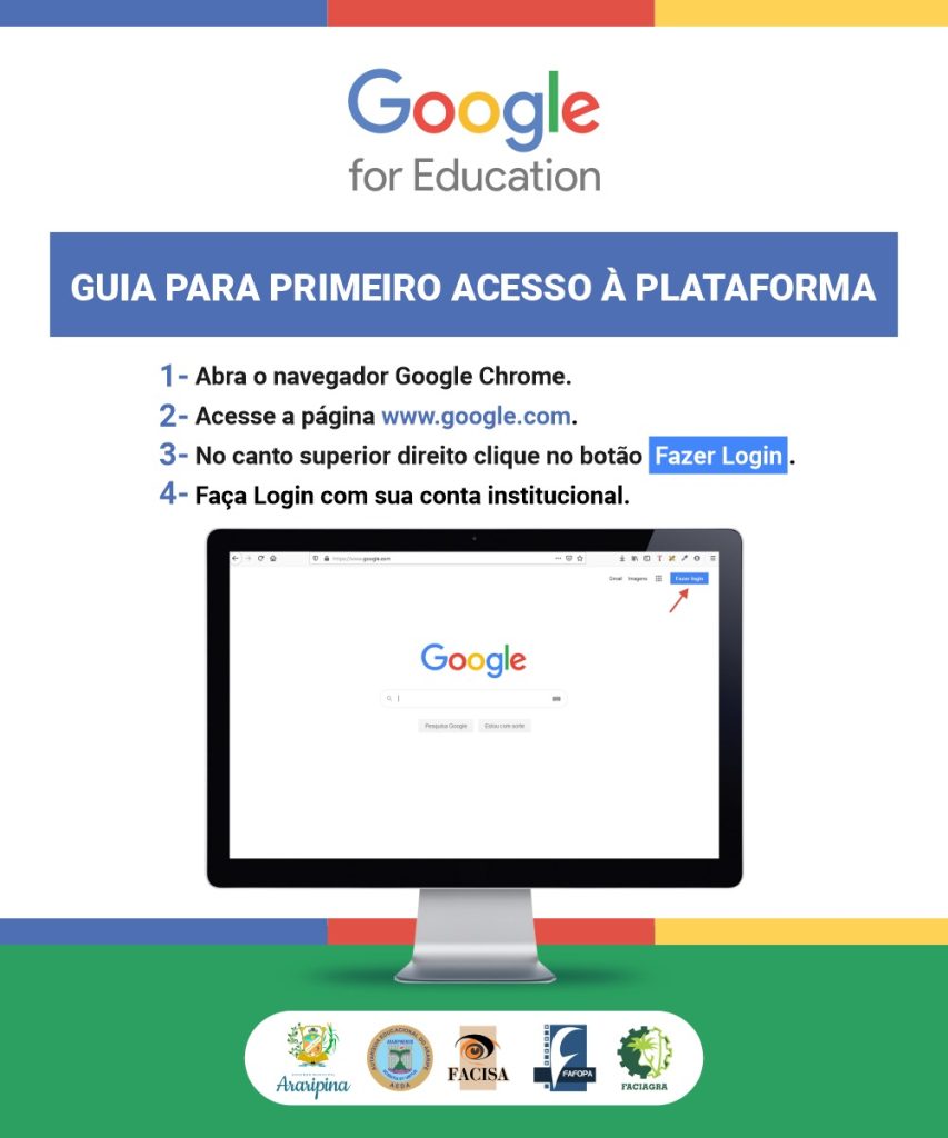Para facilitar ainda mais o entendimento de como acessar a plataforma, estaremos disponibilizando as artes explicativas e também um vídeo tutorial elaborado pela empresa Ensinar Tecnologia Educacional, que explica detalhadamente o primeiro acesso ao Gmail institucional, Google Classroom e Google Meet.