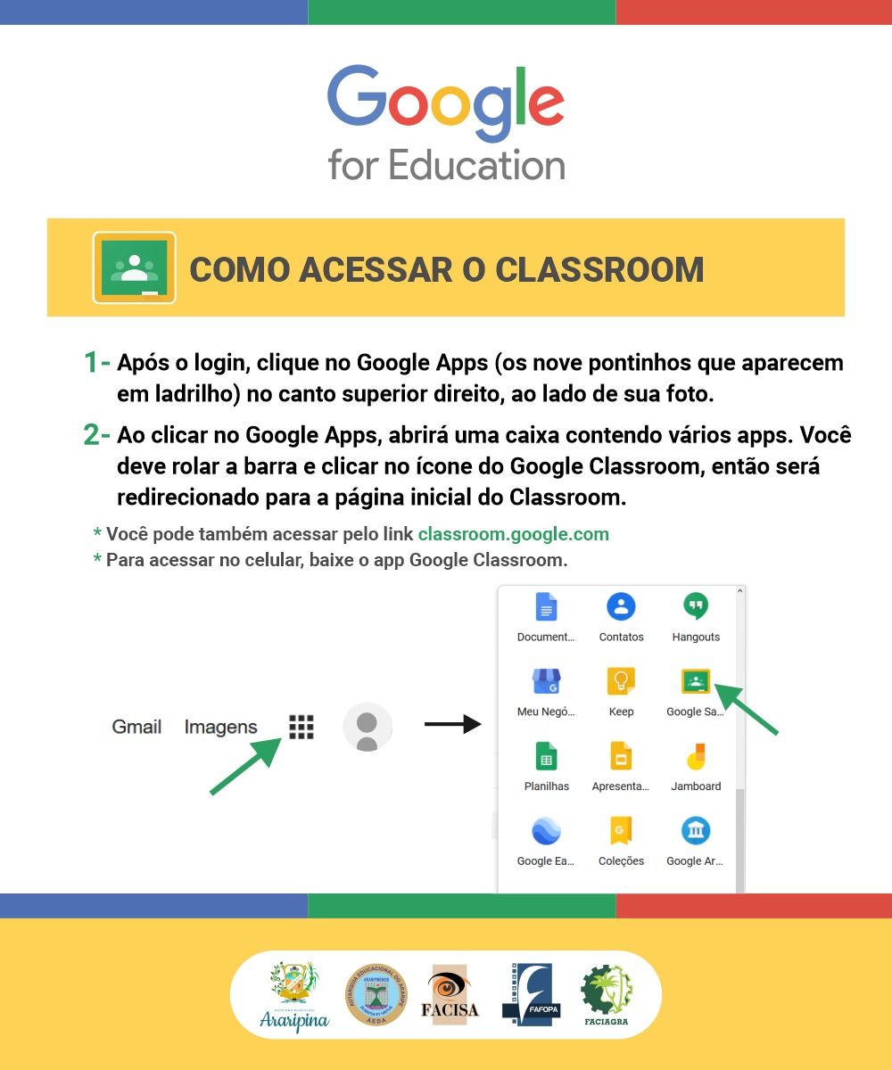 A Autarquia Educacional do Araripe (AEDA) torna público nesta quarta-feira (10) as informações de acesso a plataforma de ensino remoto adquirido pela instituição, o Google for Education. Os alunos novatos receberão dos coordenadores a planilha que contém o seu e-mail institucional e a senha para acessar a plataforma. Após localizar seu e-mail e senha, os novatos poderão seguir para as próximas etapas.