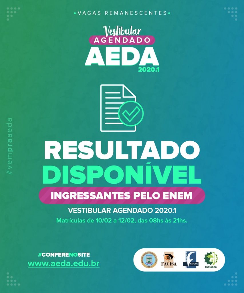 A Autarquia Educacional do Araripe torna público na tarde deste sábado (08) a relação dos candidatos aprovados pela nota do Enem no Vestibular Agendado 2020.1. Os aprovados terão entre os dias 10 e 12 de fevereiro, das 8h às 21h, para comparecerem as respectivas Secretarias munidos das documentações necessárias para que seja efetivada sua matrícula.
