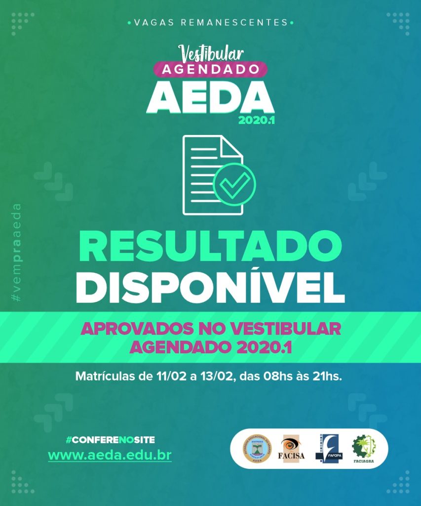 A Autarquia Educacional do Araripe (AEDA) torna público na tarde desta segunda-feira (10) a lista dos candidatos aprovados no Vestibular Agendado 2020.1. Os aprovados terão entre os dias 11 e 13 de fevereiro, das 8h às 22h, para comparecerem as respectivas Secretarias munidos das documentações necessárias para que seja efetivada sua matrícula.