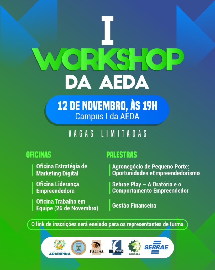 A Autarquia Educacional do Araripe (AEDA), em parceria com o Sebrae – Araripina – estará realizando no dia 12 de novembro, às 19h, o I Workshop da instituição de forma presencial, no Campus I da Autarquia.