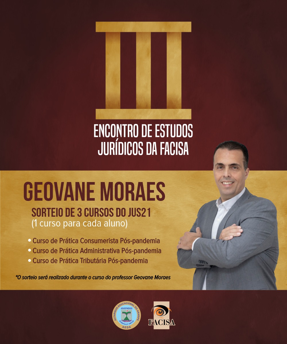 No último dia de evento haverá o sorteio de 3 cursos do JUS21 (1 curso para cada aluno) que serão sorteados pelo professor Geovane Moraes.