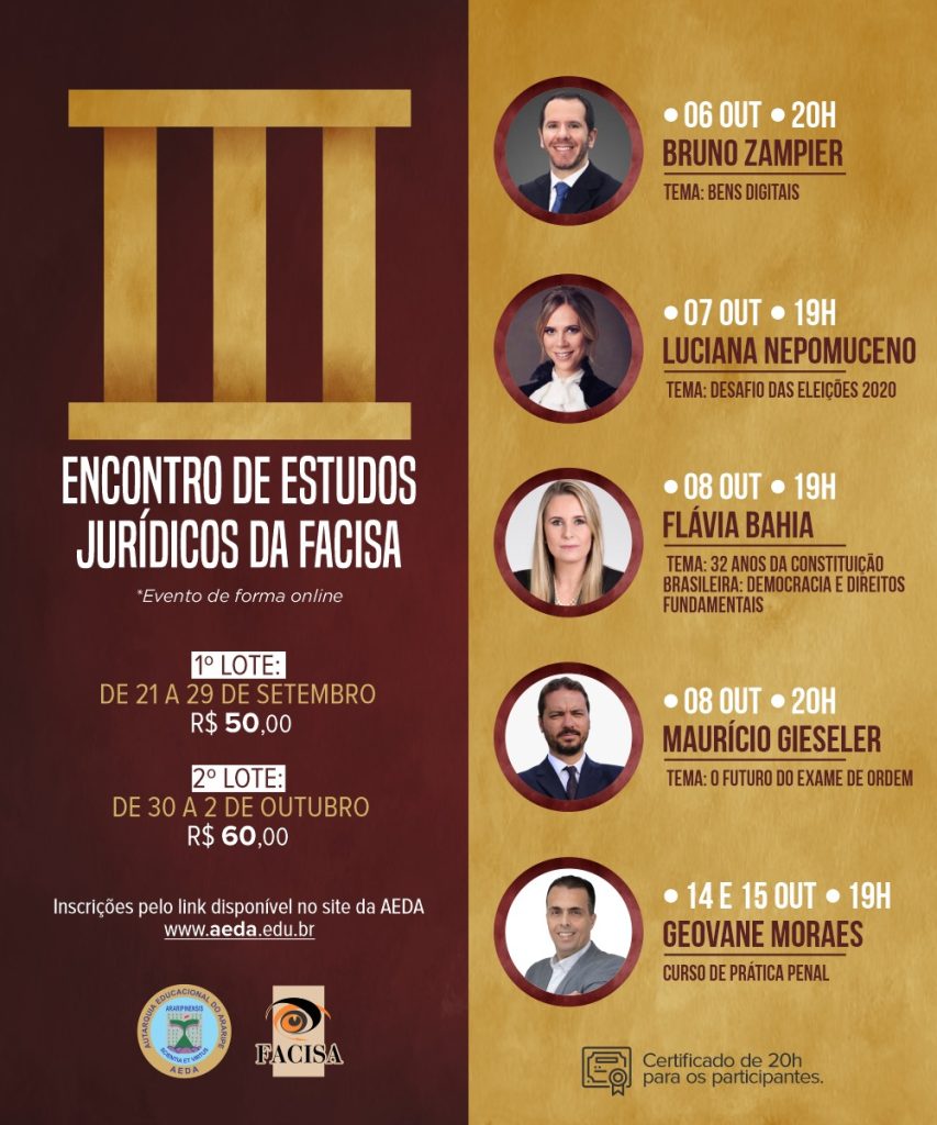 O III Encontro de Estudos Jurídicos da FACISA está com inscrições abertas para o evento, que será realizado de forma online. O 1º lote de inscrições começa nesta segunda-feira (21) e se estende até o dia 29 de setembro, no valor de R$ 50 reais. O 2º lote de inscrições começa no dia 30 de outubro e se estende até o dia 2 de outubro, no valor de R$ 60 reais. Os participantes podem se inscrever pelo link abaixo.