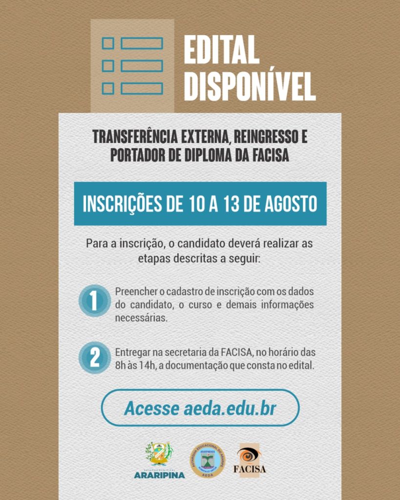 A Autarquia Educacional do Araripe (AEDA), através da FACISA, torna público o edital do processo seletivo de Transferência Externa, Reingresso e Portador de Diploma para os cursos de Administração, Ciências Contábeis e Direito.